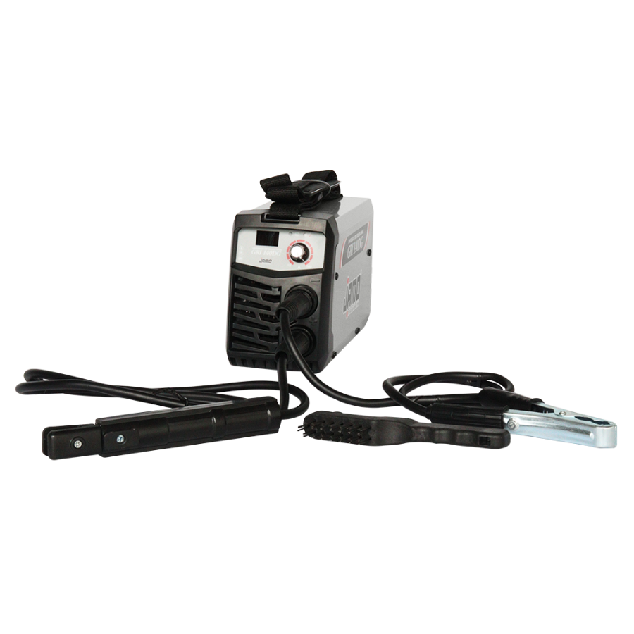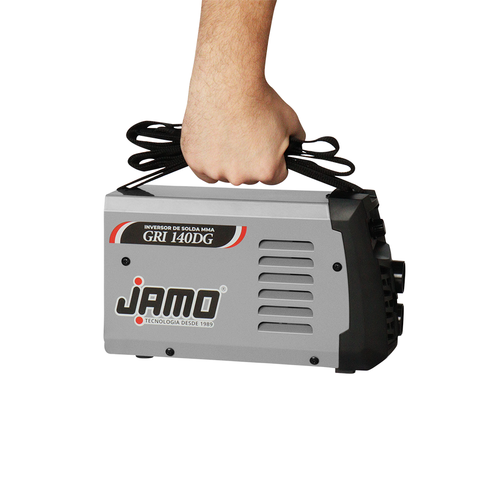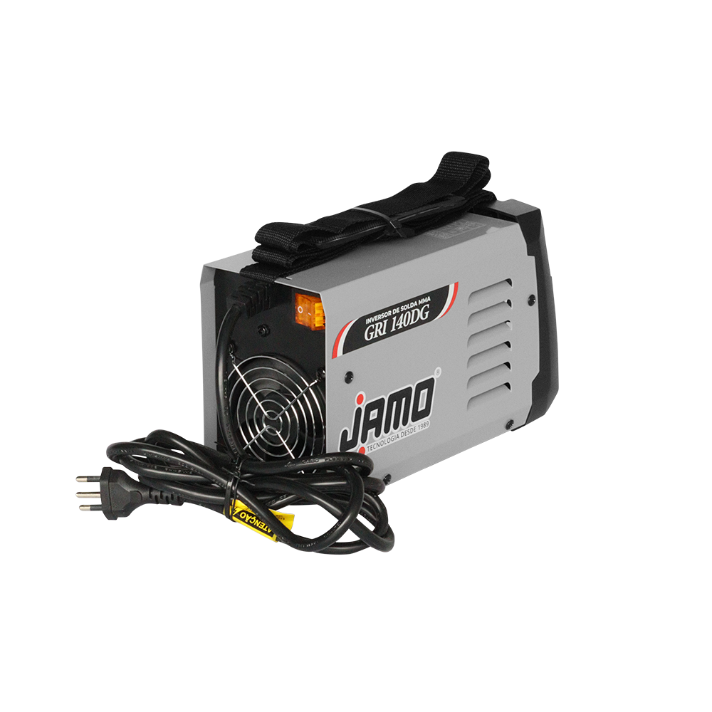 O Inversor de Solda JAMO GRI 140DG vem acompanhado de cabo de solda garra negativa, cabo de solda porta-eletrodos e alça regulável para transporte.