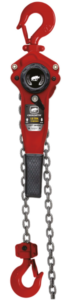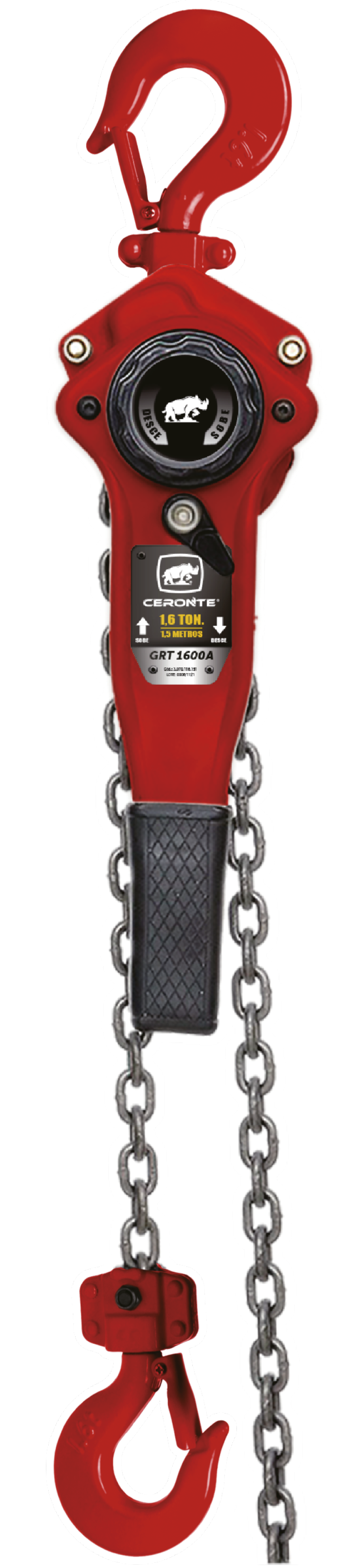 A Talha GRT 1600A possui alavanca e tem corrente de 1,5 m. Sua capacidade de içamento é de 1,6 toneladas. As correntes têm tratamento térmico, os ganchos são forjados e com trava de segurança, sua catraca é reversível e também conta com sistema de freio com trava dupla, garantindo assim maior eficiência e segurança.